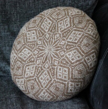 The cover is knitted as two circles which are joined together to make a round cushion cover which can be filled with a cushion pad, clean wool or trimmings from other Fair Isle projects.