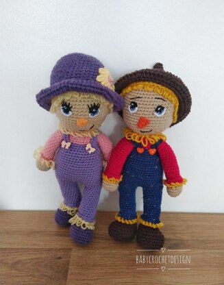 These not so scary Scarecrows are crocheted all in one piece, the legs and arms are crochet on then continue to the neck, then head. The only pieces to sew on are the hat and trimmings.