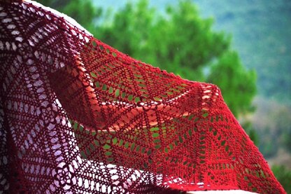Variations of the fundamental hexagon motif are used in this design to shape the shawl without breaking the spectacular geometric pattern.