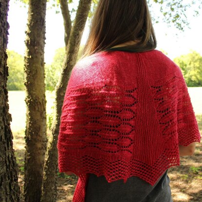 This glorious shawl, reminiscent of the Scarlet Ibis's striking plumage, showcases a lovely feathered lace section edged with a delicate mesh of garter lace.