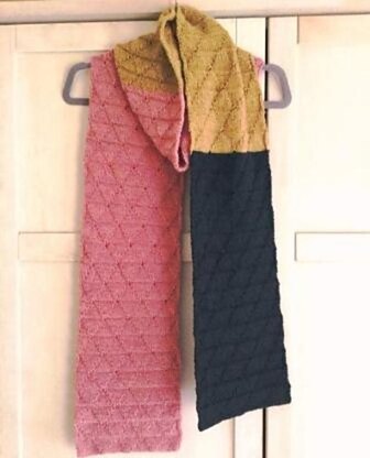 Der dreifarbige, lange Schal mit geometrischem Muster ist eine toller wärmender Blickfang zu jeder Jacke oder Mantel.