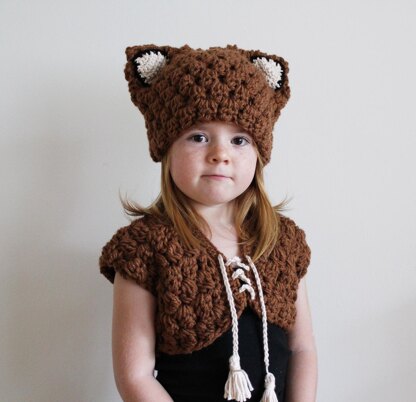 This set was inspired by my saucy little red-headed fox. The puff stitch hat and vest are very quick to work up, with easy to follow directions. The tail on the vest really make this a stand-out piece for dress-up, costume, or just because you're feeling foxy!
