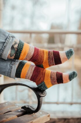 The socks are worked upwards from toe to cuffs. The foot of the sock is worked in a striped pattern. The heels are shaped using w&t short rows. The leg of the sock continues the patterning from foot. The socks are finished with short ribbed cuffs.