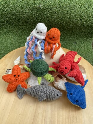 Welcome to my little knitting pattern for a plethora of super sea creatures including a turtle, manta ray, star fish, jellyfish, grey fish, lobster and octopus.