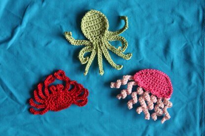 This is a crochet pattern for 3 sea creature appliques. These can be made quite small or fairly large - are great for hats, bags, blankets and so on! Sure to be favorites with your little ones as well.