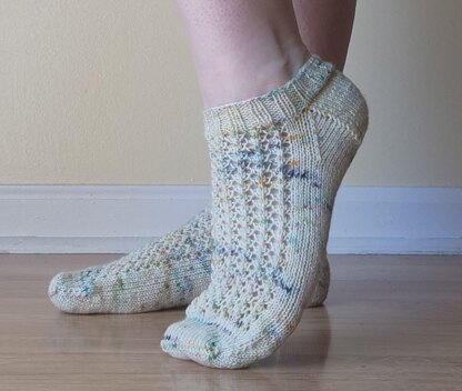 Waves ebb and flow up to the shore, the tide rolls in, and kids build sand castles all around. The Sea Shore socks were designed with a simple concept: summer days and beach waves. This lace is reminiscent of waves washing ashore, tiny sandcastles being swept out with each wave.