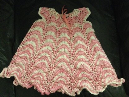This is a top-down knitted dress worked in the round in increasing fan stitch, which creates a scalloped bottom border at all but the smallest size. The self-striping yarn creates a seashell-like pattern. The crochet hook is used for edging around the V at the front and can also be used for stretchy cast-off.