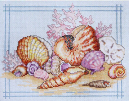 By Barbara Baatz Hillman. An ocean still life of beautiful seashells is depicted in this gorgeous design by Barbara Baatz-Hillman. Bring your favorite room to life with a picture or a pillow made with Seashells. Stitch it on larger count fabric for a stunning cushion.\n