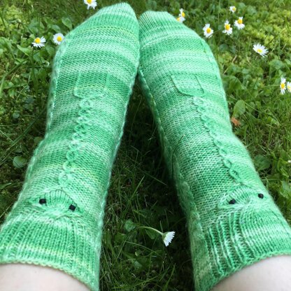 The serpentine socks are a fun interpretation for one of nature’s most interesting (or scary!) creatures. This top down sock features a cute snake sticking out it’s tongue on the front of the sock and has a cabled shadow snake down the back of the leg. Cabling usually pulls in a little, so this sock features 1 by 1 ribbing down the back of the leg for a perfect fit.