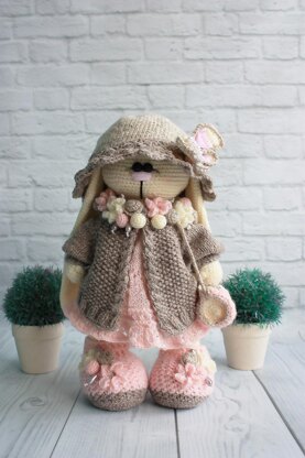 The tutorial consists of 44 pages and includes more than 130 photographs and patterns. The outfit suits 12 inches / 30-32 cm height doll. This set of clothes consists of 6 elements: pink fluffy dress; a stylish cardigan decorated with beautiful flowers and beads; a charming hat with a butterfly suddenly crouched on it; delicate-colored lovely shoes; panties with ruffles; and a glamorous handbag completes the whole image. The outfit is worked with knitting needles and crochet hook.