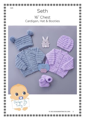 Seth is a Baby Knitting Pattern for a cardigan, 2 styles of hat, a square hat or a beanie hat and booties to fit a baby 16'' chest (finished size)using DK yarn with 3.25mm & 4mm needles. You will need 200g of DK yarn to make the whole set.