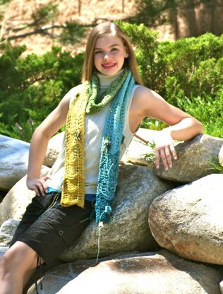 This scarf is knit with 2 strands of yarn held together throughout. The scarf uses 7 basic colors and there are multiple color changes from Goldenrod on one end to Teal on the other. In order for the ends to be the same, the scarf is knit in 2 halves and then joined with Kitchener stitch (an internet address for a great tutorial on knitty.com is included in the pattern). In addition, feathers are added for whimsy and extra interest. After all, swans do have feathers. For more information about knitting with feathers, email knittingwithfeathers@aol.com