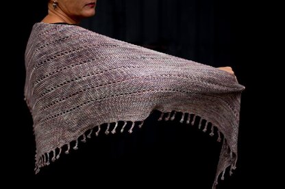 “Shades of Pale” is a slightly asymmetrical triangular shawl worked sideways in relaxing garter stitch with simple eyelet rows for variety and easy-to memorize fringe elements on the two longer sides. The fringe is worked as you go in predetermined intervals on the first side, then more fringe is added during the bind-off row on.