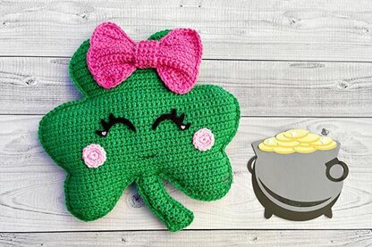 Our finished Shamrock Kawaii Cuddler® is 11″ x 11″. Hook size, yarn choice, and crochet tension will affect each individual result.