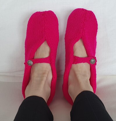 These easy knit, stocking stitch slippers are worked in 8ply yarn and have a strap across the foot.
