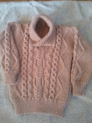 Shawl collar jumper suitable for boy or girl aged 3-4 years with double moss stitch and cable panels