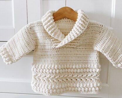Shawl Collar Sweater will be perfect for both – boys and girls. It’s worked bottom up, with no seams, then divided for back and front. Only seams to make are shoulder and collar seams, both can be made with a crochet hook.