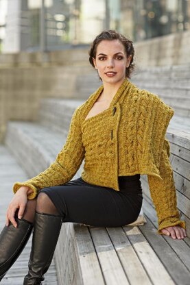 A sleeve that ends in a shawl, worked in reversible cables with two very different sides and lined by checks, made to drape and pin together as you wish. The cables are worked half in rib, half in reverse stockinette stitch, and provides a soft contrast to the curvy checks. Knit in the round to the armhole, then flat on the shawl to the hem at the end. This is a conceptual accessory with a modern shape.