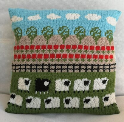 A Knitting Pattern for a unique hand-knit cushion featuring a countryside scene with sheep in the field and poppies growing in the hay meadow.