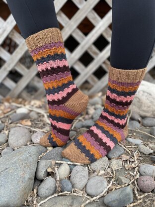 You can choose to only do the striping on the leg of the sock (pgs 5-6), which will generally use less than 10g of each CC (depending on size and length), or stripe the entire sock (pgs 3-4), which will use 20g or less of each CC (depending on size and length). You could also use more than 5 colors or only use 2 colors for the stripes, but yarn usage will differ from amounts given.