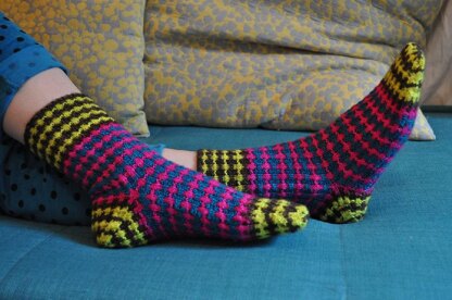 Top-down color work with an afterthought heel for contiguous patterning. As pictured, size M/L in foot length US 9 uses: A - 28 grams brown B - 18 grams yellow C - 28 grams pink D - 28 grams teal