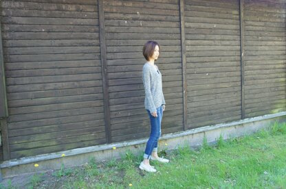 “Shiny” is a simple and comfortable, deep V-neck pullover. It is worked seamlessly from the top-down. The upper back is cast on first and the triangular shape is produced with German short rows. The back is set aside at the underarm and stitches are picked up along the cast-on edge for the fronts. They are knit straight with slipped stitch edge (SSE) to the underarm, then joined with the back. The body is finally joined in the round at the tip of the V and tapered to the hem. Sleeves stitches are picked up around the arm opening and worked down in the round. The body hem and cuffs are worked in twisted 1×1 rib and finished with I-cord edging. Do not pull yarn too tightly when working SSE.