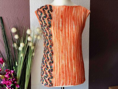 Das Top wird in zwei Teilen quer gestrickt. Die bunten Streifen findest du auf Vorder- und Rückenteil und sind der absolute Hingucker. Noch dazu macht dieses Shirt eine tolle Figur.