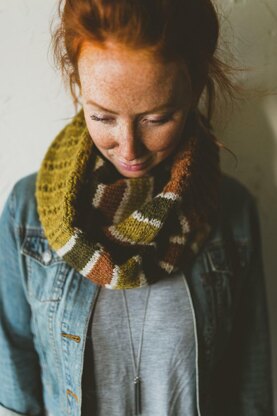 As relaxing to knit as it is cozy to wear, this infinity cowl makes a lovely gift – whether to yourself or for a friend. Colorful stripes are broken up by sections of easy-to-memorize openwork, creating the perfect color playground and stash-busting opportunity. The cowl is knit in the round for a double-thick fabric that’s attractive on both sides, then grafted to make a loop.