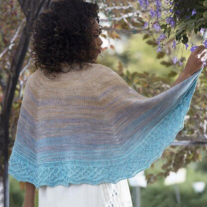 Knitting this semi-circle shawl with a hand-dyed gradient set feels like a walk toward the ocean. Starting with a garter tab in the color of sand dunes, work your way outward toward sundrenched waves in a tropical sea of cables.