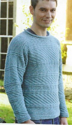A loose fitting sweater in a textured pattern of knit and purl stitches.