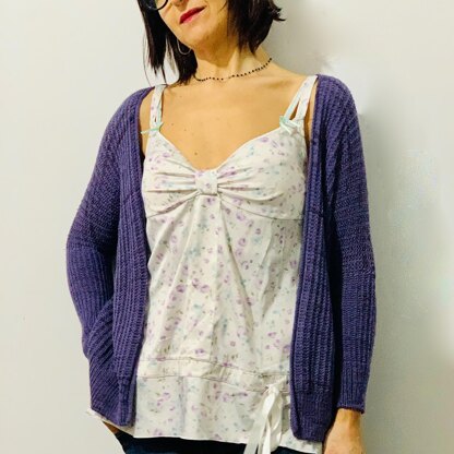 Short closed is a boxy cardigan and it is worked from the top down seamlessly. The fronts and back are first worked back and forth separately with short-row shoulder shaping. They are joined at the underarm, and the lower body is knitted in one piece to the hem. Sleeves sts are picked up around the arm openings and worked down in the round. The front and neck edging is finished neatly with I-cord.