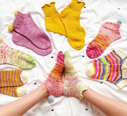 Shorty socks are such a fun, satisfying, quick knit! This set includes THREE shorty sock patterns! The Basic B is a great, all-around (basic!) shorty sock. All the Frills allows you to get a little fancy with a cute ruffled cuff. The Pom Squad Sneaker Sock has a band of arch support, and of course a pom on the cuff for when you want your socks to be enthusiastic!
