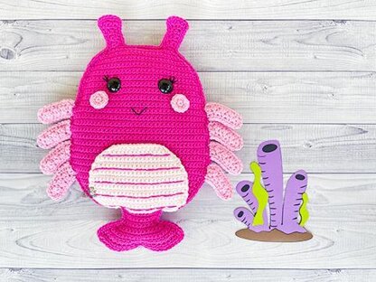 Our finished Shrimp Squish Kawaii Cuddler® is 15" x 14". Hook size, yarn choice, and crochet tension will affect each individual result.