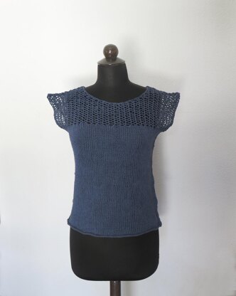 Sibyl Top This summer top is made with a rustic cotton/linen blend yarn. It has a mesh panel both in back and front, a round neckline and shoulder shaping. It is worked from bottom to top back and forth in circular needles size 3.5mm and 4mm (or size to obtain gauge).