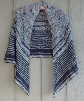 Half circular shawl worked all in garter stitch featuring two single ply yarns. The two yarns used in this project were single ply yarns and though one is called sport and one fingering weight, both (to me) are closer to fingering weight. A great project to use one of your speckled yarns with a solid from your stash.