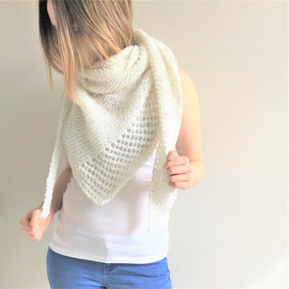 Although the yarn is chunky/bulky, it has lovely drape when knitted on larger needles and is perfect for cooler summer evenings as a shawl, or over a coat on a freezing day in winter as a scarf or extra layer. It is knitted as an asymmetric scarf shawl with a straight, lacy end section, but it is practically a triangle when completed. This is an easy pattern, perfect for the beginner or for knitting while you natter with friends.