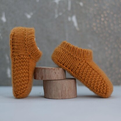 The Simeon baby shoe is knitted version of a baby trainer with a cute ribbed cuff and garter stitch side detail. They're a perfect knit to whip up over a weekend. Part of my stay-on shoe range, baby can kick, crawl, pull and they'll still have warm little toes! They are knit in the round with no seams and the finishing is minimal.