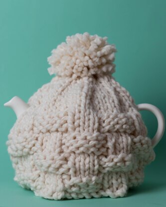 The tea cosy features an interesting to knit basketweave stitch and a fun pompom finishes the piece perfectly.