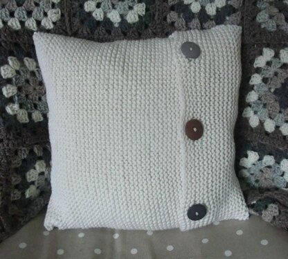 A simple, modern, chunky cushion cover that even a novice can make ... Made in chunky yarn so it's quick to make as well ... It fastens with 3 buttons so that the cover can be removed for washing as well as being a design feature ...