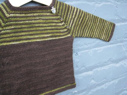 The Simply Stripy Sweater - For Baby is a top down raglan with a striped yoke & a button closure. It's knit all in one piece with no seaming & limited finishing. There is also instructions to customize including 3 striping variations, 3 closure options for shoulder seam, 4 sleeve options, and instructions to modify it into a dress or bodysuit (onesie).