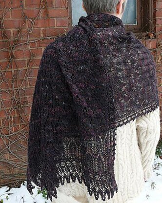 A rectangle stole in two sizes featuring lace patterns that evoke the magical textures and colorful highlights of the raven’s cloak. Shawl is worked from center back to hem, with a small edging incorporated at the selvedges, and an applied (knitted on) edging to finish the hem. Recommended for handpainted yarns with subtle color variations. Using laceweight yarn and smaller needles will result in a decrease in overall shawl size; using the instructions for the larger stole is recommended with finer yarns.