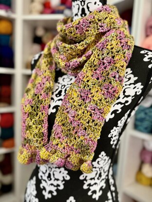 ⭐️ Construction: The body of the scarf is a simple 2-row repeat with stitches that fit logically on top of each other. The flounce is 2 double crochets worked in each stitch which causes the ends to pucker.