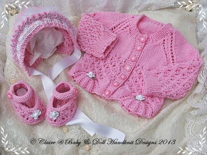 Pattern Two: Pattern for girls - cardigan, bonnet and shoes preemie-3m babies. 3-ply for preemies, 4-ply for early baby, and DK for newborn and 0-3m