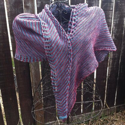 1 skein of fingering weight yarn is enough for the small size, and 2 skeins make a lovely larger sized wrap.. Any weight of yarn may be used, keeping in mind the quantities required and needle size will change. The shawl can be knit with any weight of yarn, keeping in mind adjustments will need to be made to the amount of yarn needed and the needle size you will use. I made the large two coloured striped version using two full skeins of sock yarn. Instructions for the striped version and a lacy version are included in the pattern.