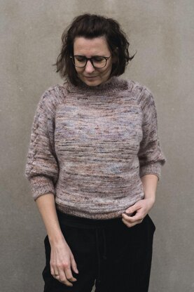 Skein sweater is a hip-length style knit with a mock neck and short balloon sleeves. Fit is slightly oversize and sweater bottom width is a little bit shrunken that gives a feminine silhouette to it. Sleeves are short and have balloonish shape and are decorated with cable knit alongside the sleeve center to the cuffs. Skein sweater is worked top-down in Stockinette stitch pattern that makes it easy to customize to fit your preferred sweater and sleeves length. Skein sweater is a very feminine silhouette knit that fits well with skirts, dresses, and of course with various pants.