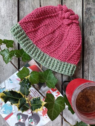 This is a close fitting crochet beanie worked from the top down, in the round and seamless. You will need a full skein of the red yarn but less than half a skein of the green. It is a one size pattern (up to 57cm/ 22.5in head) and I have marked it as a child to teenager size. The model for my pattern is 10 years old but it also fits me as an adult with a relatively small head.