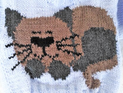 With a baby on the way I wanted to make some warm jumpers for keeping him snug when out and about. This jumper has a sleeping cat picture on the front which is worked in intarsia from a chart.