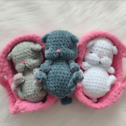 A one-piece crochet pattern of a small sleeping cat in a cradle.