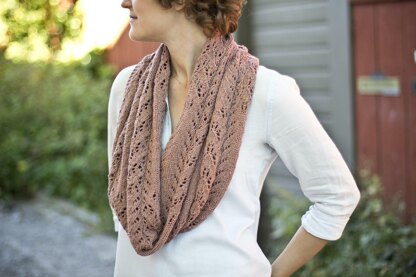 Slipstream begins with a provisional cast on and is worked flat, knitting back and forth along the width of the cowl. Each row begins and ends with four knitted stitches, which creates a simple garter stitch edge that keeps the edges from curling. There are two lace motifs, which alternate across the width and length of the cowl. Once the desired length is reached, the cowl is grafted together using the Kitchener stitch for a seamlessly connected loop.