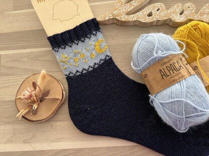 The Selene socks are knitted toe-up. You start with the toe, which is knitted in the traditional way, increasing on each side, and finish with the ankle, which is knitted in ribbing. The ankle is decorated with a moon and stars motif knitted in Fair Isle.